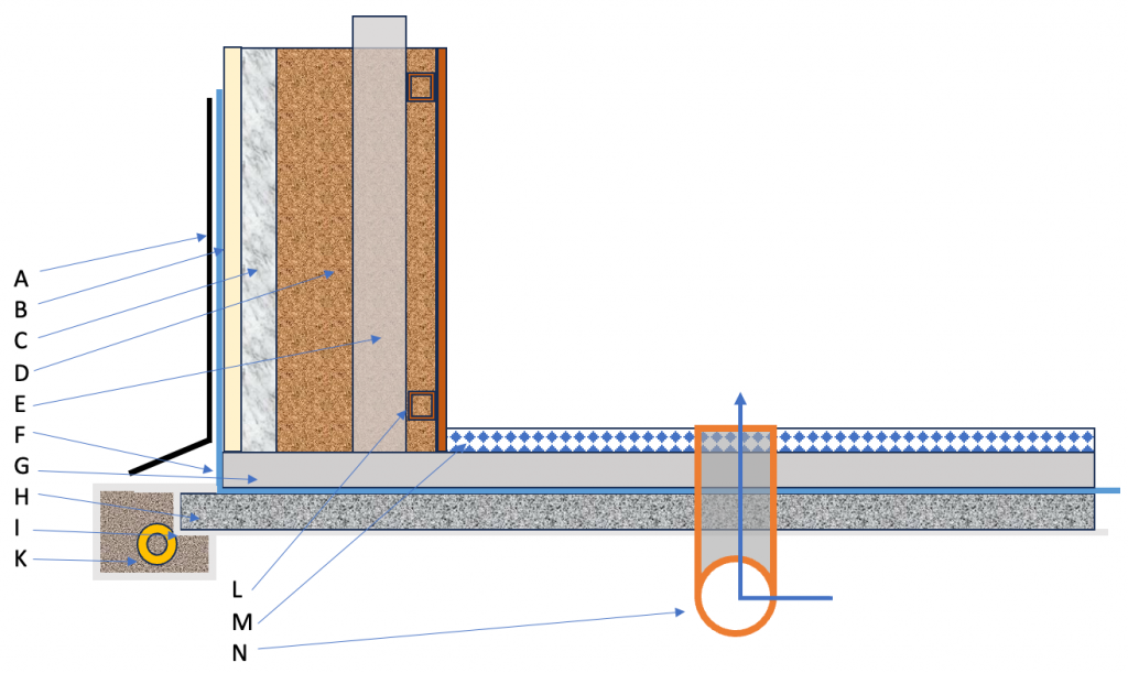 M: Estrich mit Fußbodenheizung – Ziel ist es, Solarenergie zu nutzen, oder die Beheizung durch einen Massenofen, falls erforderlich, vorzunehmen.